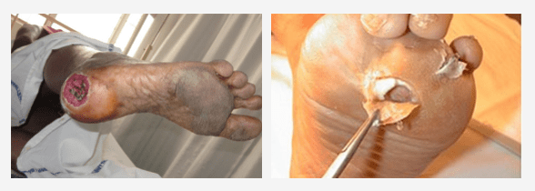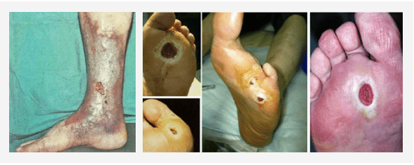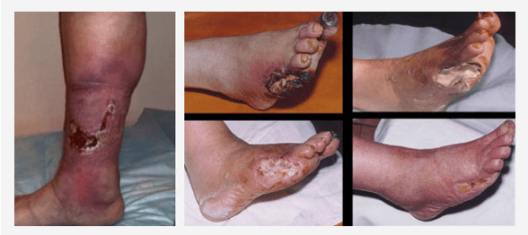bolest stopala (čirevi, gnojno-nekrotični procesi) na pozadini oštećenja perifernih nerava, krvnih sudova, kože, mekih tkiva;