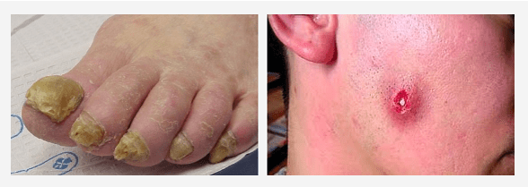 razne zarazne komplikacije (česte pustularne lezije kože, gljivice noktiju, itd.);